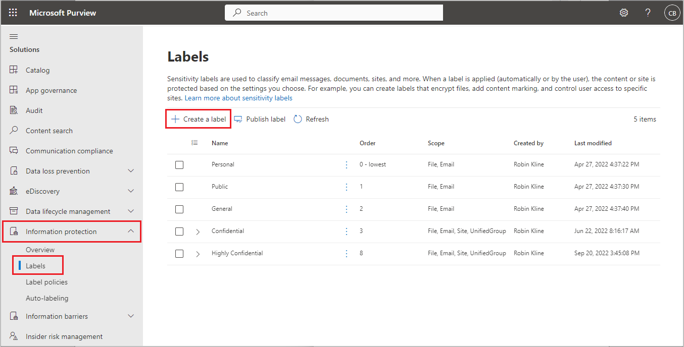 Bruk Microsoft 365 sikkerhetssenter til å opprette og konfigurere følsomhetsetikettene. Angi regler for automatisk klassifisering, eller la brukerne selv velge etiketter.